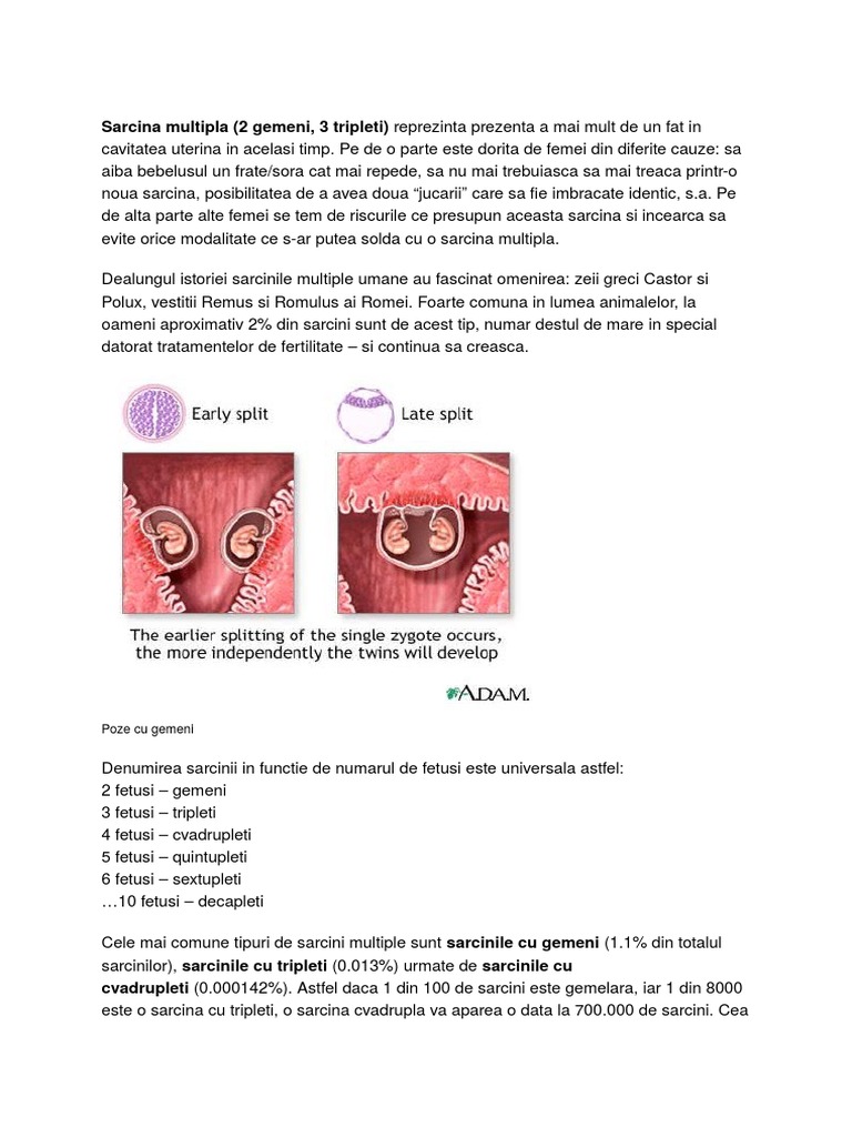 Saptamanile de sarcina sunt insotite de poze si video pentru a descrie procesele prin care trece embrionul / fatul pe parcursul sarcinii sarcina pe saptamani poze. Majoritatea sarcinilor gemelare sau multiple sunt descoperite in timpul unei ecografii.